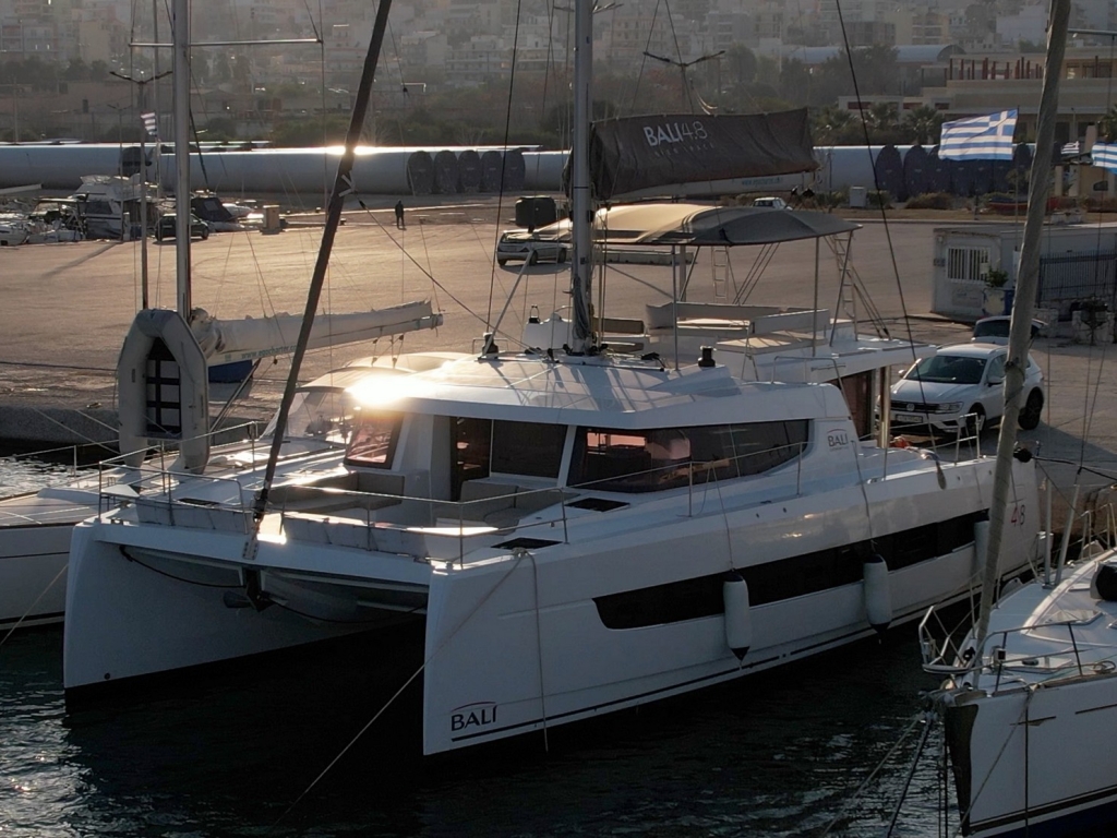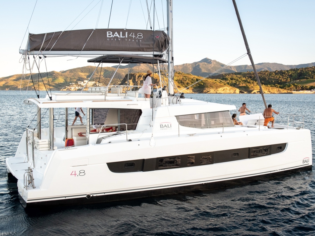The Eagle Bali 4.8 is a striking and modern cruising catamaran, designed for families, friends, and groups seeking a comfortable and spacious Mediterranean sailing experience. Built by the renowned French shipyard Bali Catamarans, this impressive 49-foot (14.86 m) catamaran offers exceptional volume, stability, and innovative design, making her a standout choice for relaxed yet luxurious charters.