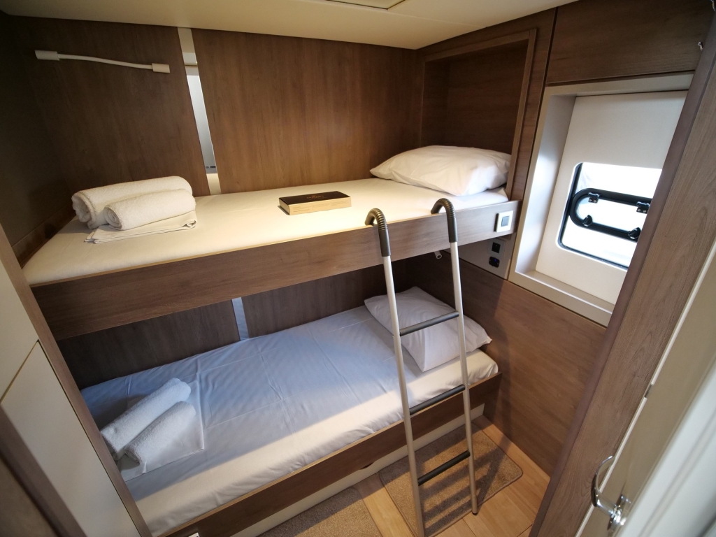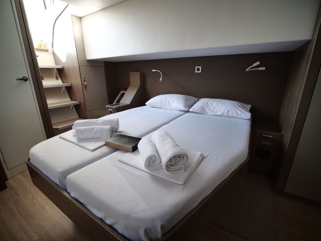The Eagle Bali 4.8 is typically configured with 5 guest cabins plus a skipper cabin, offering accommodation for a range of group sizes, and features 6 en-suite bathrooms for added privacy and convenience. Thoughtfully designed cabins, ample storage, and bright, airy interiors make her particularly well suited to families and multi-generational groups. The yacht’s layout encourages easy movement throughout, ensuring both safety and comfort for guests of all ages.